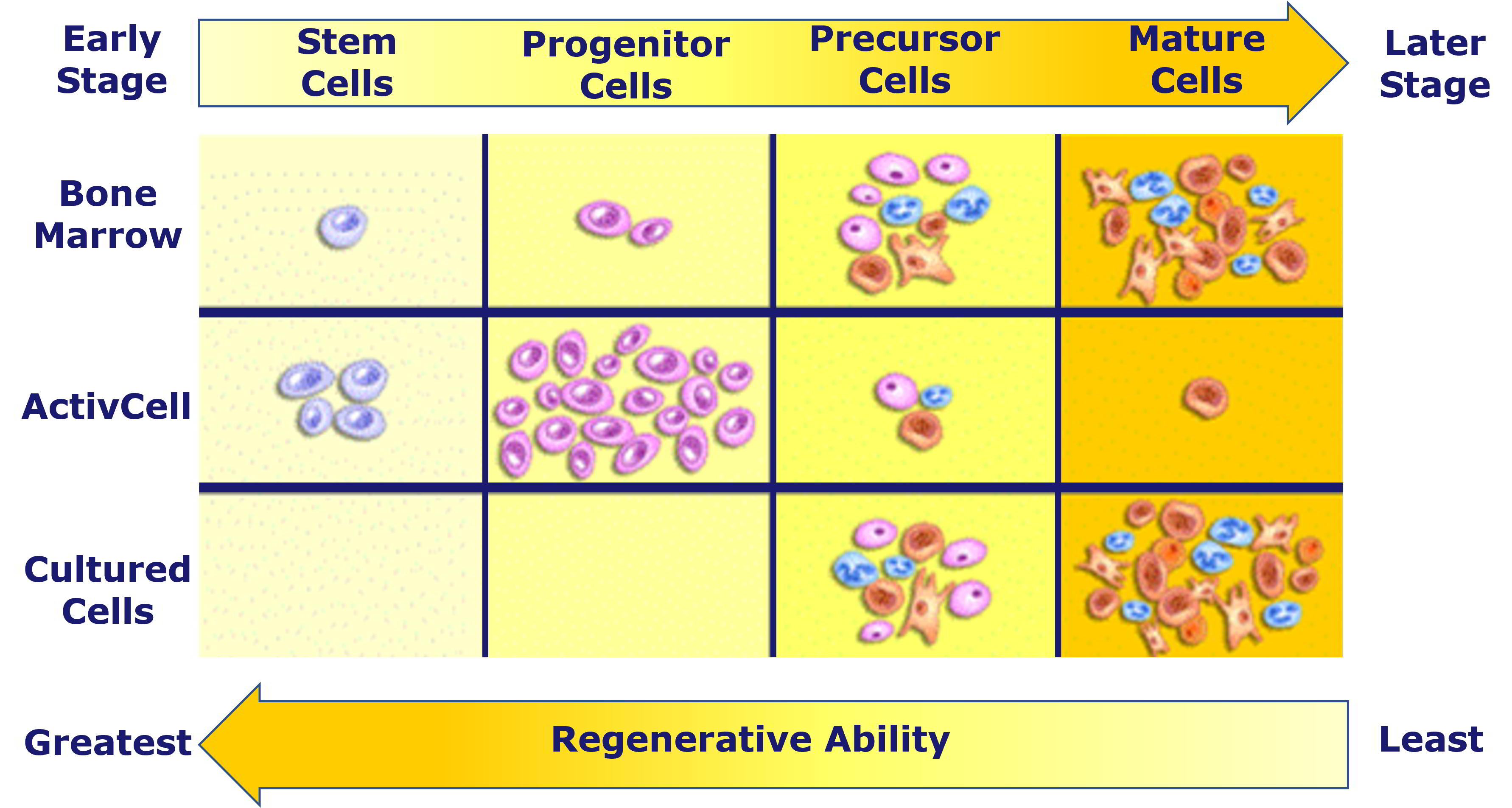 Cells have a natural tendency to differentiate, and it is extremely difficult to prevent premature differentiation during a cell culture process. Tissue regeneration products based on culture cells have proven ineffective because while these products contain an abundant number of mature cells, they lack the early stage populations necessary to create blood vessels and connective tissues. Our proprietary ActivCell process reduces the ratio of later stage cells to earlier types because it allows the stem and progenitor cell populations to self-replicate without undergoing differentiation, all without an ex vivo culture process.